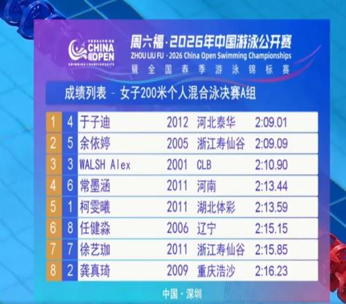 中国游泳公开赛迎来最后一个比赛日,13岁的中国游泳新星于子迪再次闪耀全场,在女子200米个人混合泳决赛,于子迪在最后一个50米几乎落后一个身位的情况下,上演了疯狂逆袭,最终以2分09秒01夺冠,几乎全程领先的余依婷在最后时刻被逆转,2分09秒09获得亚军,亚历克斯·沃尔什2分10秒90获得季军。
